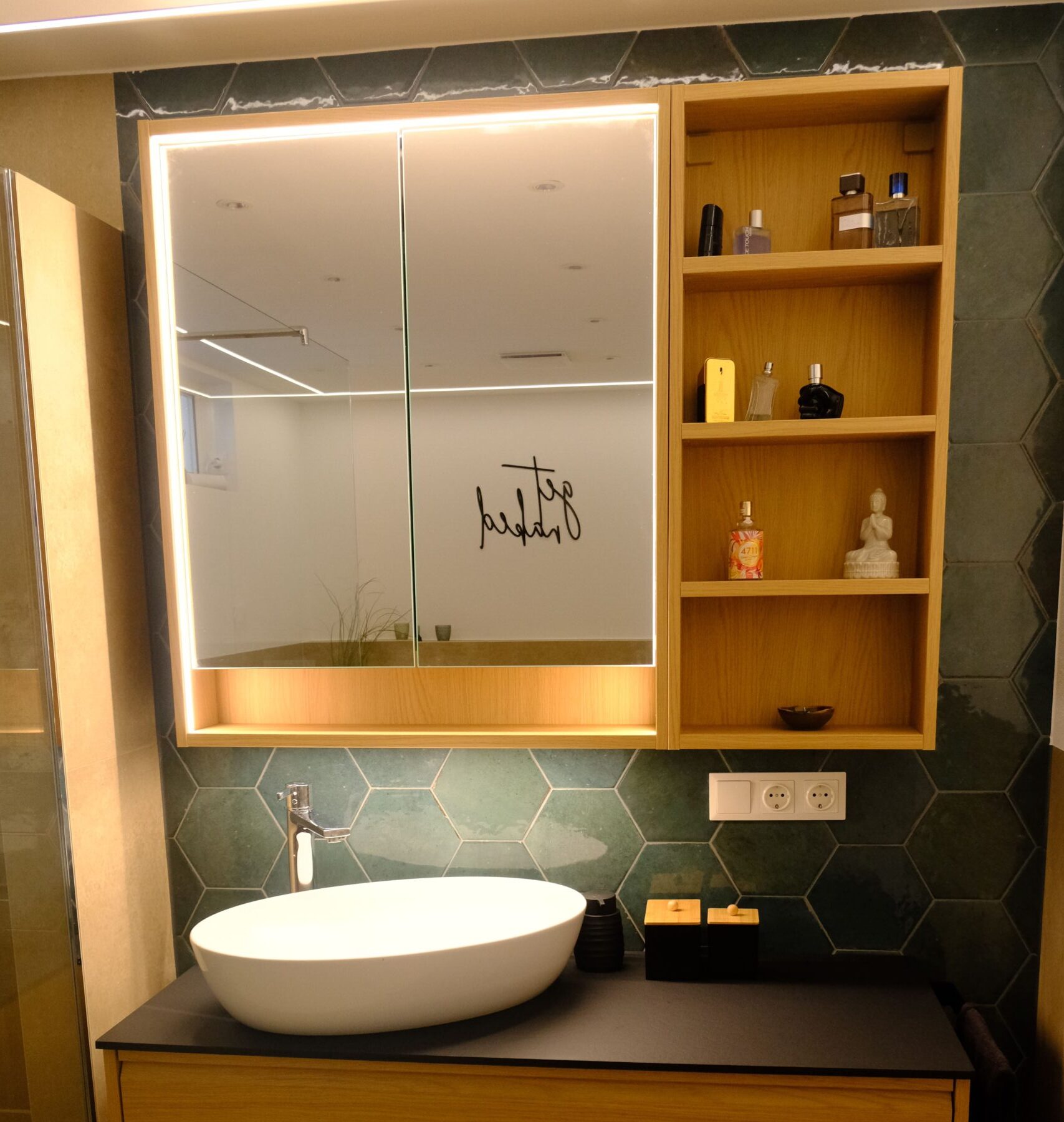 Bei diesem Projekt haben wir das gesamte Bad neu gefliest. Die großen hellen Fliesen lassen den gesamten Raum freundlich und gemütlich wirken. Grüne Fliesen geben einen schönen Kontrast und runden das Bad ab.